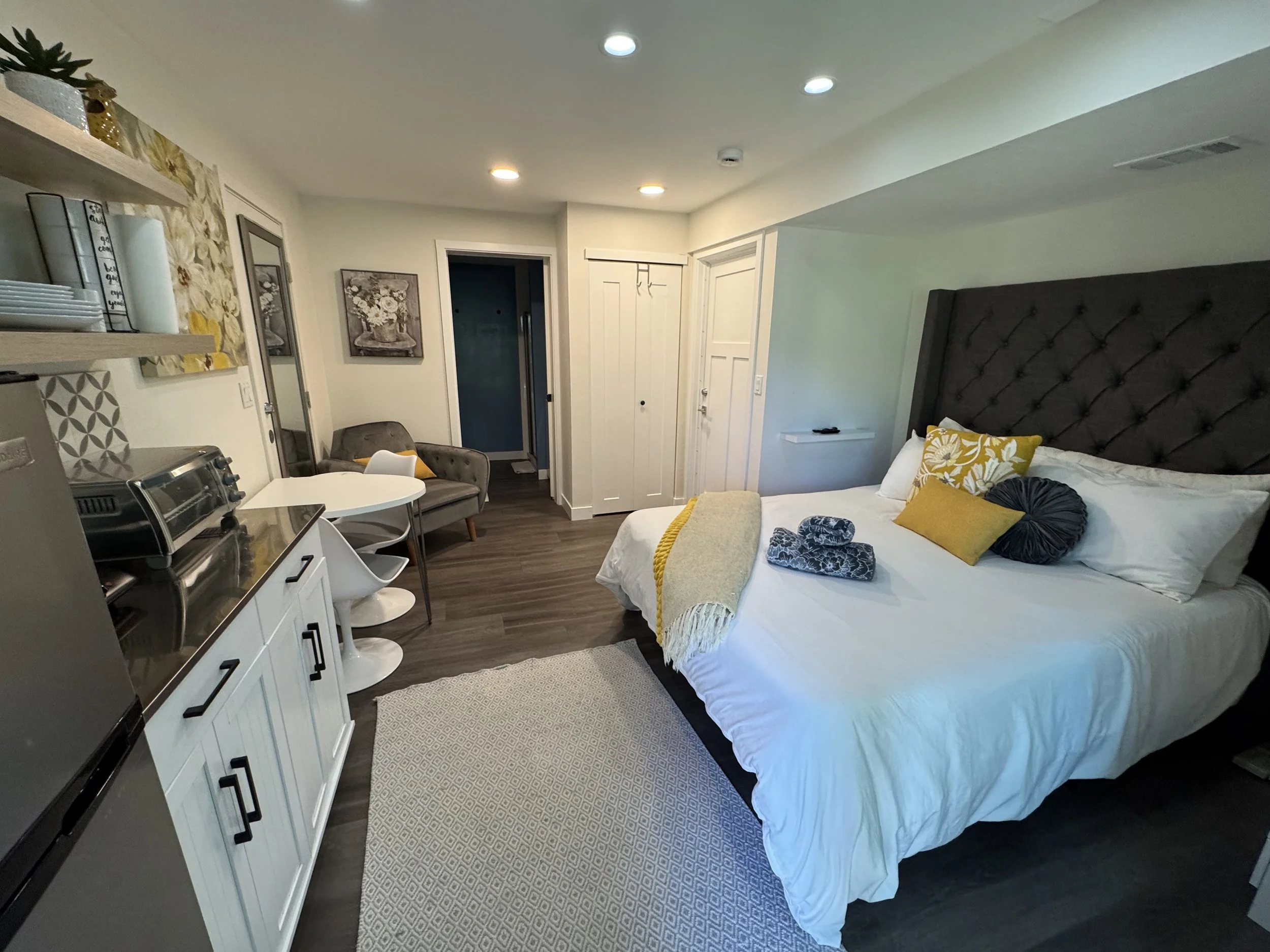 Studio apartment with a large bed, decorative pillows, towel, small dining table with chairs, kitchenette area with a refrigerator, and artwork on the walls.
